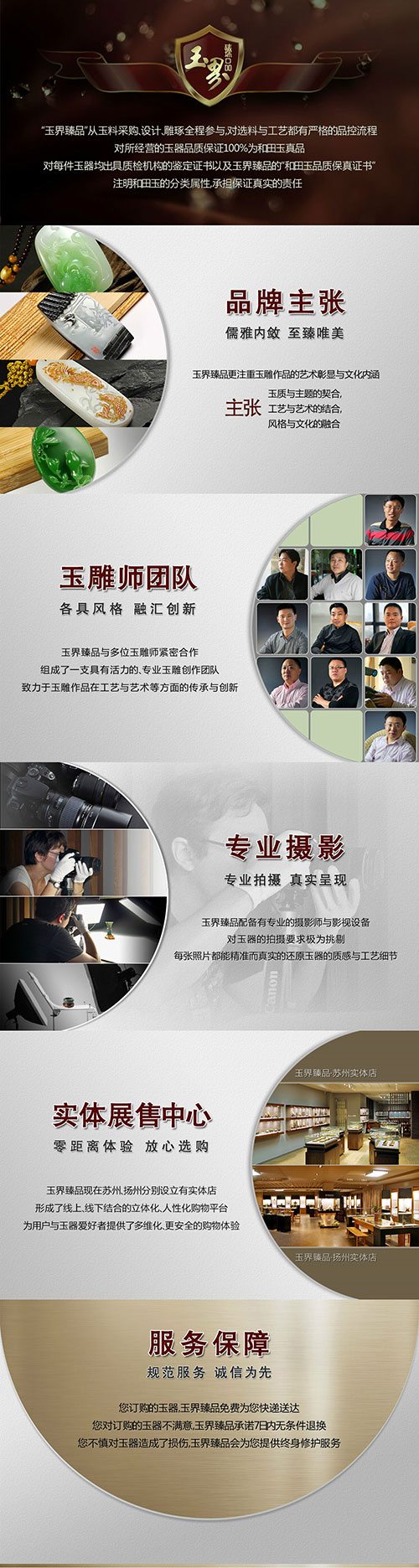玉界臻品集玉料采购、设计雕刻和汇展营销的于一体,与业界多位知名的工艺美术师、玉雕大师紧密合作,形成了专业的玉雕设计、创作团队,坚持玉雕作品的原创性与独特性。玉界臻品在扬州设立有线下体验展厅与销售专区,其中汇集了中国南北派风格各异的玉雕作品,欢迎爱好和田玉的朋友与藏家关注、光临。